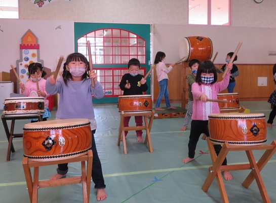 最後は4歳児の和太鼓発表!初めて大勢のお友達の前での発表に少し緊張した様子でしたが、今までで最高の仕上がり!