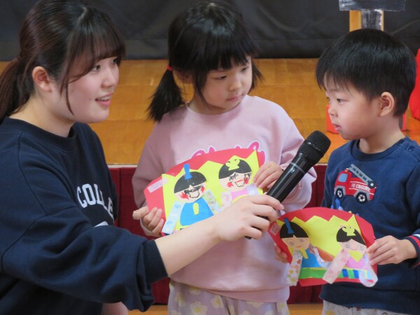 各クラスの子どもたちが、鬼退治のために鬼のお面と豆入れを制作し、みんなで可愛い?怖い?鬼に変身!!そして、ホールで待ち伏せしていたのは、年長児の鬼たち!!年長組の迫力に圧倒されながらも、各クラスの子どもたちは丸めた新聞紙で作った豆を懸命に投げて鬼退治することが出来ていました。