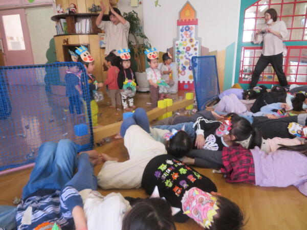 年長児の鬼を退治して、一息ついた頃…さっきよりも大きな鬼がお部屋に現れて、子どもたちは大慌て💦勇敢に豆を投げる子、一目散に走り隅に隠れる子等さまざまな姿がありました。
